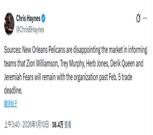 此前曾有不少猜测,认为鹈鹕可能会为围绕新秀奎因和费尔斯重建,将锡安、墨菲或琼斯摆上交易货架。值得注意的是,鹈鹕队并不拥有自己的2026年首轮选秀权,这意味着他们本赛季没有任何动机对阵容进行中期重建。