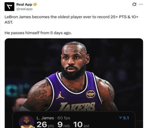 凭借这样的表现,41岁零11天的詹姆斯也超越5天前的自己,成为NBA历史上单场拿到至少25+10助最老的球员。